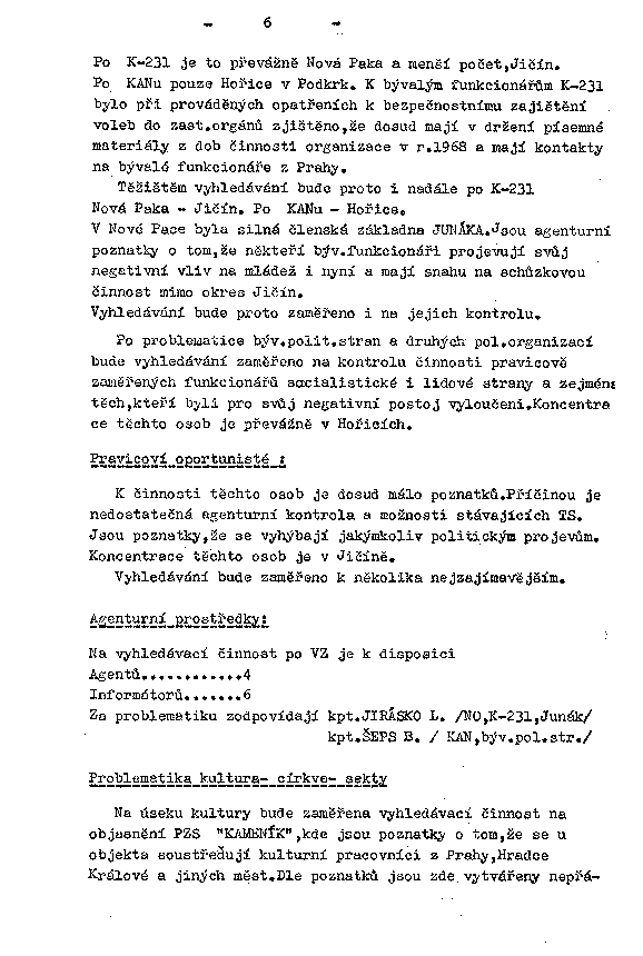 Po KANu pouze Hořice v Podkrk. K bývalým funkcionářům K-231 bylo při prováděných opatřeních k bezpečnostnímu zajištění voleb do zast. orgánů zjištěno, že dosud mají v držení písemné materiály z dob činnosti organizace v r.1968 a mají kontakty na bývalé funkcionáře z Prahy.