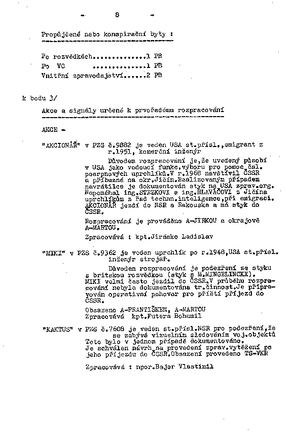 Důvodem rozpracování je, že uvedený působí v USA jako vedoucí funkc.výboru pro pomoc čsl. posrpnových uprchlíků. V r.1968 navštívil ČSSR a příbuzné na okr.Jičín. Realizovaným případem navrátilce je dokumentován styk na USA zprav.org. Napomáhal ing.STEZKOVI a ing.HLAVÁČKOVI z Jičína uprchlíkům z řad technn.inteligence, při emigraci. AKCIONÁŘ jezdí do NSR a Rakouska a má styk do ČSSR.