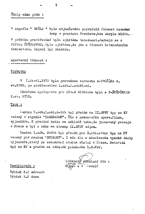 Cestou I.odb.1.odd.S-Stb byl předán na II.SFMV typ na KV vedený v signále "KAMERAMAN". Šlo o pracovníka zprav.filmu, výjezdáře. K předání došlo na základě toho, že jmenovaný pracuje v Praze a byl o něho se strany II.SFMV zájem.