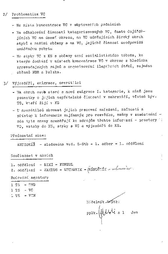 - Na okruh osob staré a nové emigrace I. kategorie, k nimž jsou poznatky o jejich nepřátelské činnosti v zahraničí, včetně býv. TS, kteří žijí v KS