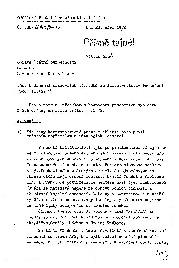 Podle rozkazu předkládám hodnocení pracovních výsledků O-Stb Jičín, za III.čtvrtletí r.1972.