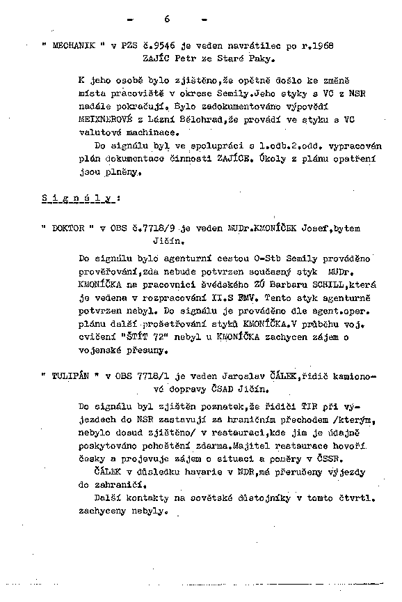 Do signálu byl zjištěn poznatek, že řidiči TIR při výjezdech do NSR zastavují za hraničním přechodem /kterým, nebylo dosud zjištěno/ v restauraci, kde jim je údajně poskytováno pohoštění zdarma. Majitel restaurace hovoří česky a projevuje zájem o situaci a poměry v ČSSR.
