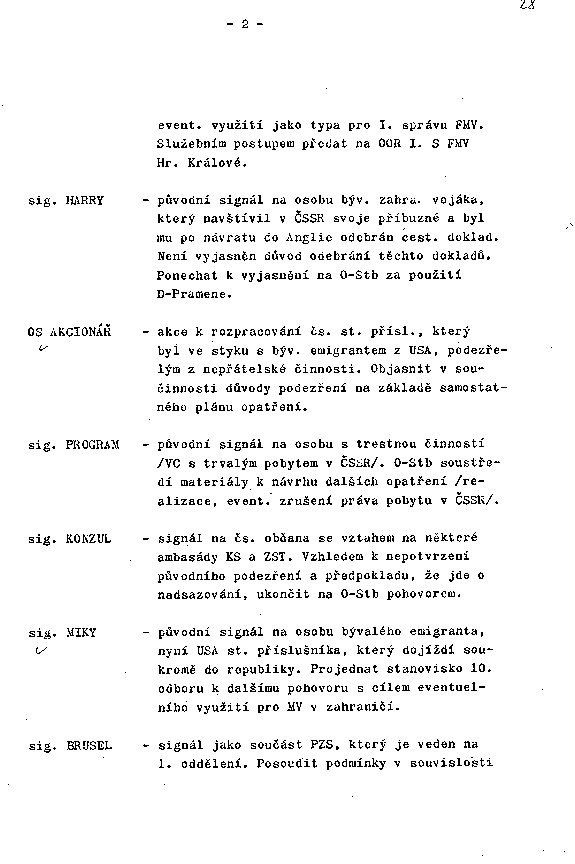 sig. HARRY - původní signál na osobu býv. zahra. vojáka, který navštívil v ČSSR svoje příbuzné a byl mu po návratu do Anglie odebrán cest. doklad. Není vyjasněn důvod odebrání těchto dokladů. Ponechat k vyjasnění na O-Stb za použití D-Pramene.
