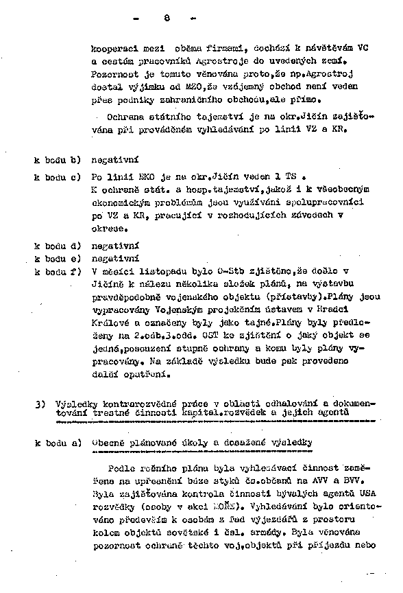 k bodu f) V měsíci listopadu bylo O-Stb zjištěno, že došlo v Jičíně k nálezu několika složek plánů, na výstavbu pravděpodobně vojenského objektu (přístavby). Plány jsou vypracovány Vojenským projekčním ústavem v Hradci Králové a označeny byly jako tajné. Plány byly předloženy na 2.odb. 3.odd. OST ke zjištění o jaký objekt se jedná, posouzení stupně ochrany a komu byly plány vypracovány. Na základě výsledku budu pak provedeno další opatření.