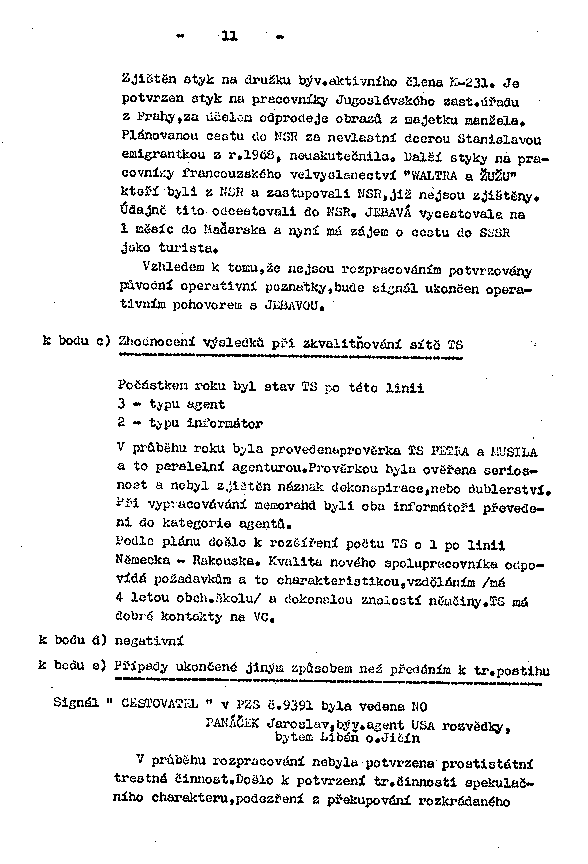 Zjištěn styk na družku býv.aktivního člena K-231. Je potvrzen styk na pracovníky Jugoslávského zast.úřadu z Prahy, za účelem odprodeje obrazů z majetku manžela. Plánovanou cestu do NSR za nevlastní dcerou Stanislavou emigrantkou z r.1968, neuskutečnila. Další styky na pracovníky francouzského velvyslanectví "WALTRA a ŽUŽU" kteří byli z NDR a zastupovali NSR, již nejsou zjištěny. Údajně tito odcestovali do NSR. JEBAVÁ vycestovala na 1 měsíc do Maďarska a nyní má zájem o cestu do SSSR jako turista.