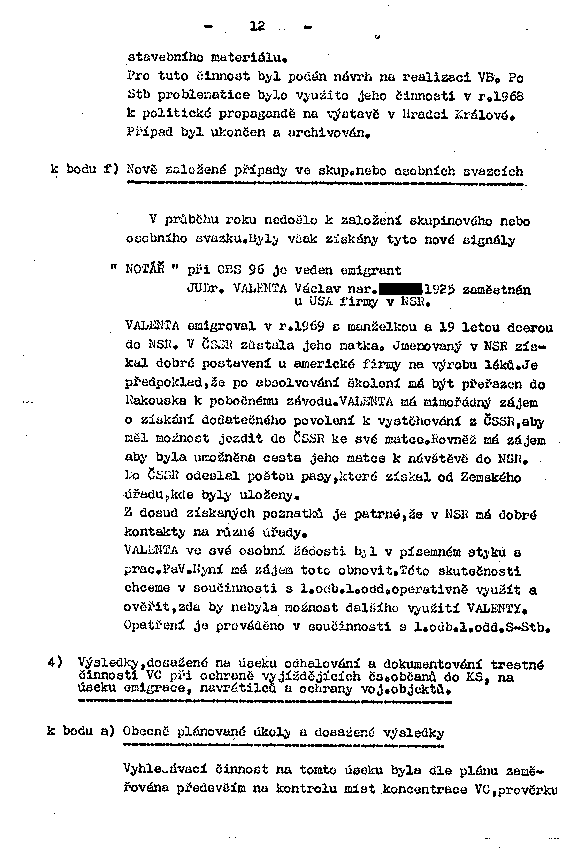 VALENTA emigroval v r.1969 s manželkou a 19 letou dcerou do NSR. V ČSSR zůstala jeho matka. Jmenovaný v NSR získal dobré postavení u americké firmy na výrobu léků. Je předpoklad, že po absolvování školení má být přeřazen do Rakouska k pobočnému závodu. VALENTA má mimořádný zájem o získání dodatečného povolení k vystěhování z ČSSR, aby měl možnost jezdit do ČSSR ke své matce. Rovněž má zájem aby byla umožněna cesta jeho matce k návštěvě do NSR. Do ČSSR odeslal poštou pasy, které získal od Zemského úřadu, kde byly uloženy.