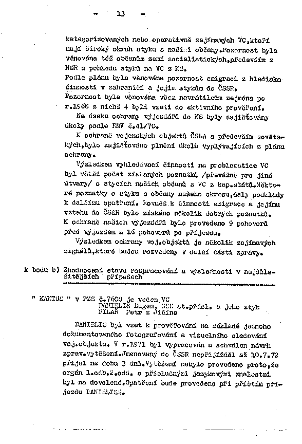 DANIELIS byl vzat k prověřování na základě jednoho dokumentovaného fotografování a vizuelního sledování voj.objektu. V r.1971 byl vypracován a schválen návrh zprav. vytěžení. Jmenovaný do ČSSR nepřijížděl až 10.7.72 přijel na dobu 3 dnů. Vytěžení nebylo provedeno proto, že orgán 1.odb.2.odd. s příslušnými jazykovými znalostmi byl na dovolené. Opatření bude provedeno při příštím příjezdu DANIELISE.