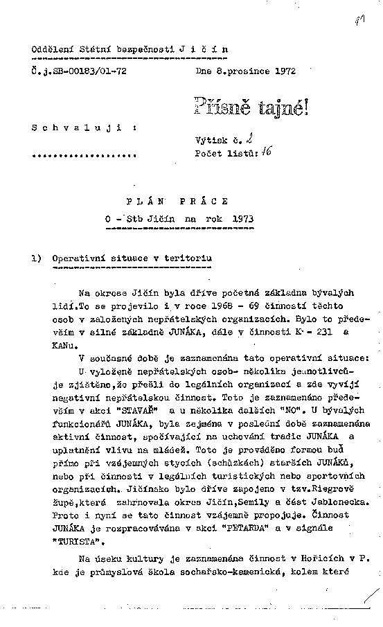 U vyloženě nepřátelských osob - několika jednotlivců - je zjištěno, že přešli do legálních organizací a zde vyvíjí negativní nepřátelskou činnost. Toto je zaznamenáno především v akci "STAVAŘ" a u několika dalších "NO". U bývalých funkcionářů JUNÁKA, byla zejména v poslední době zaznamenána aktivní činnost, spočívající na uchování tradic JUNÁKA a uplatnění vlivu na mládež. Toto je prováděno formou buď přímo při vzájemných stycích (schůzkách) starších JUNÁKů, nebo při činnosti v legálních turistických nebo sportovních organizacích. Jičínsko bylo dříve zapojeno v tzv.Riegrově župě, která zahrnovala okres Jičín, Semily a část Jablonecka. Proto i nyní se tato činnost vzájemně propojuje. Činnost JUNÁKA je rozpracovávána v akci "PETARDA" a v signále "TURISTA".