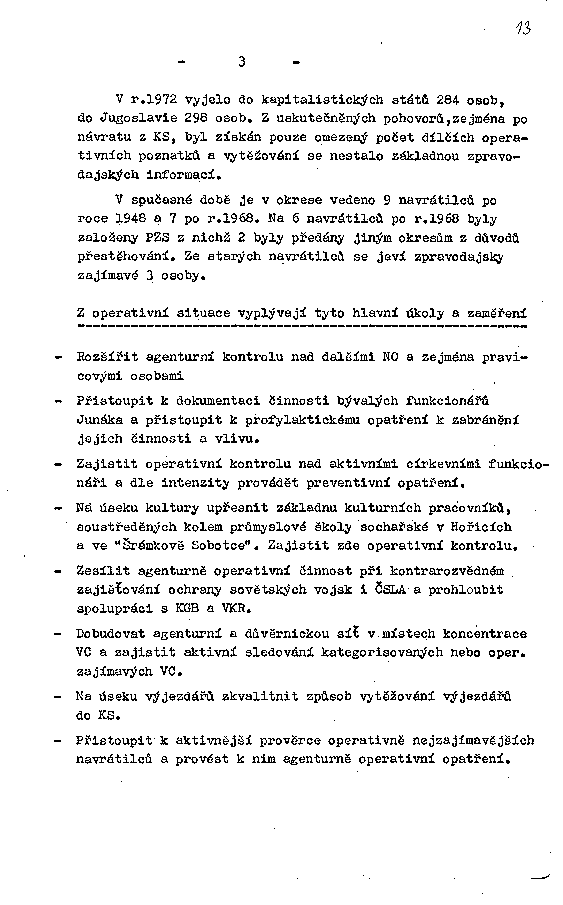 V r.1972 vyjelo do kapitalistických států 284 osob, do Jugoslávie 298 osob. Z uskutečněných pohovorů, zejména po návratu z KS, byl získán pouze omezený počet dílčích operativních poznatků a vytěžování se nestalo základnou zpravodajských informací.
