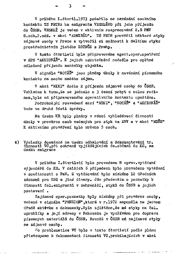 V průběhu I.čtvrtl.1973 podařilo se navázání osobního kontaktu TS PETRA na emigranta VESELÉHO při jeho příjezdu do ČSSR. VESELÝ je veden v aktivním rozpracování 2.S FMV 8.odb. 2.odd. v akci "ADMIRÁL". TS PETR prověřil některé styky zájmové osoby v Praze a vytvořil si možnosti k dalšímu styku prostřednictvím jistého KOTRČE z Prahy.