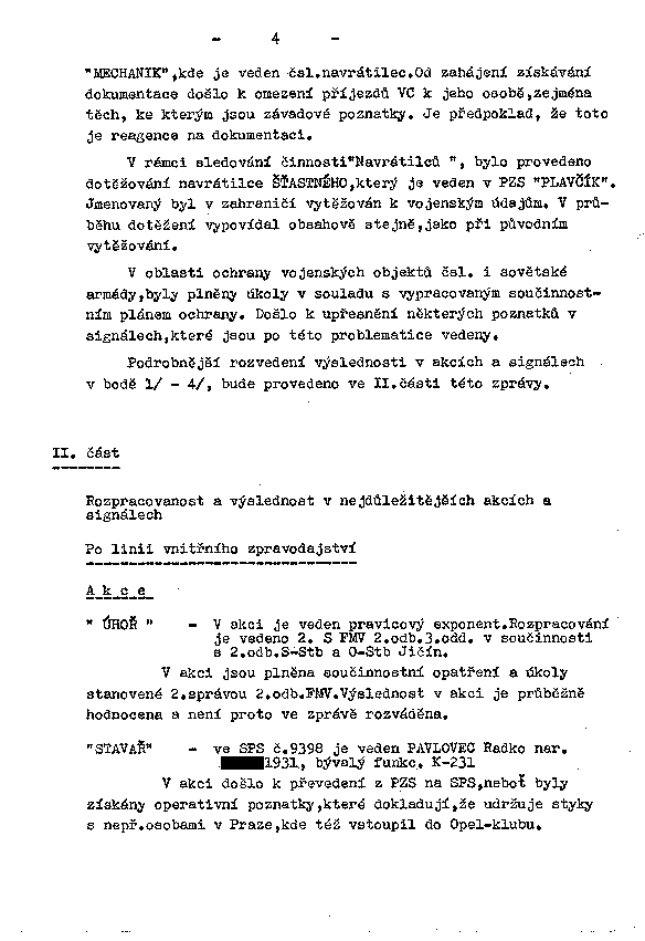 V akci došlo k převedení z PZS na SPS, neboť byly získány operativní poznatky, které dokladují, že udržuje styky s nepř. osobami v Praze, kde též vstoupil do Opel-klubu.