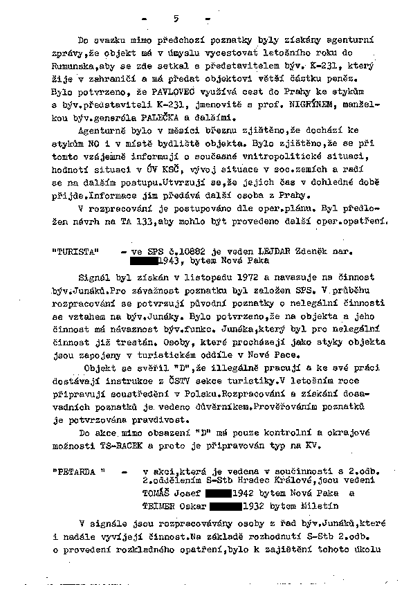 Do svazku mimo předchozí poznatky byly získány agenturní zprávy, že objekt má v úmyslu vycestovat letošního roku do Rumunska, aby se zde setkal s představitelem býv. K-231, který žije v zahraničí a má předat objektovi větší částku peněz.