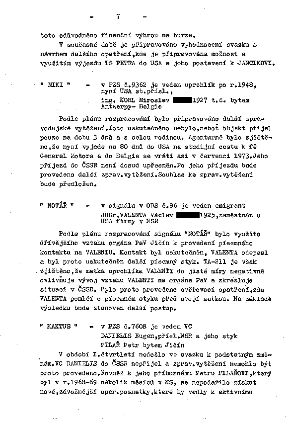 Podle plánu rozpracování signálu "NOTÁŘ" bylo využito dřívějšího vztahu orgána PaV Jičín k provedení písemného kontaktu na VALENTU. Kontakt byl uskutečněn, VALENTA odepsal a byl proto uskutečněn další písemný styk. TA-211 je však zjištěno, že matka uprchlíka VALENTY do jisté míry negativně ovlivňuje vývoj vztahu VALENTY na orgána PaV a zkresluje situaci v ČSSR. Bylo proto provedeno ověřovací opatření, zda VALENTA pomlčí o písemném styku před svojí matkou. Na základě výsledku bude stanoven další postup.