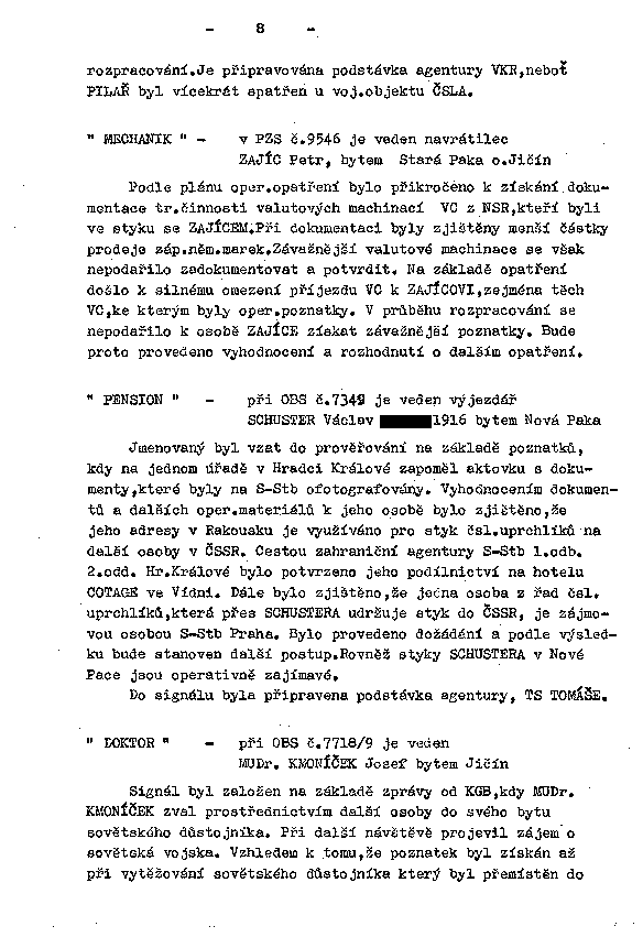 Jmenovaný byl vzat do prověřování na základě poznatků, kdy na jednom úřadě v Hradci Králové zapoměl aktovku s dokumenty, které byly na S-Stb ofotografovány. Vyhodnocením dokumentů a dalších oper.materiálů k jeho osobě bylo zjištěno, že jeho adresy v Rakousku je využíváno pro styk čsl.uprchlíků na další osoby v ČSSR. Cestou zahraniční agentury S-Stb 1.odb.2.odd. Hr.Králové bylo potvrzeno jeho podílnictví na hotelu COTAGE ve Vídni. Dále bylo zjištěno, že jedna osoba z řad čsl.uprchlíků, která přes SCHUSTERA udržuje styk do ČSSR, je zájmovou osobou S-Stb Praha. Bylo provedeno dožádání a podle výsledku bude stanoven další postup. Rovněž styky SCHUSTERA v Nové Pace jsou operativně zajímavé.