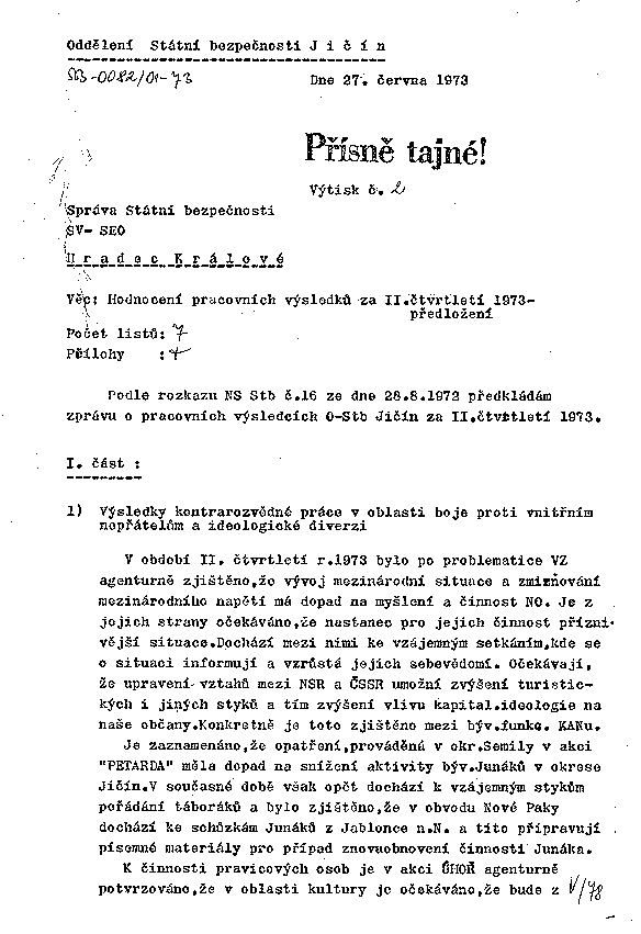 Podle rozkazu NS Stb č.16 ze dne 28.8.1972 překládám zprávu o pracovních výsledcích O-Stb Jičín za II.čtvrtletí 1973.
