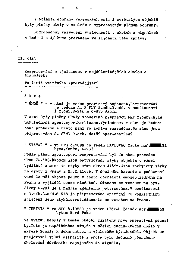 Podle plánu agent.oper. rozpracování byl do akce proveden úkon TA-133. Úkonem jsou potvrzovány styky objekta v rámci bydliště a mimo to styky mimo okres Jičín. Jsou zachyceny styky na osoby z Prahy a Hr.Králové. V důsledku havarie a poškození vozidla měl objekt pohyb v tomto čtvrtletí omezen, zejména na Prahu a vyjížděl pouze služebně. Činnost se vztahem na býv. členy K-231 je i nadále agenturně potvrzována. V součinnosti s 2.odb. 2.odd. S-Stb je připravováno opatření ke konkretnímu zjištění jeho styků, event.činnosti se vztahem na Prahu.