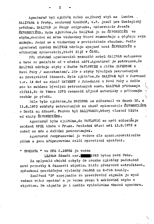 Agenturně byl zjištěn velmi zajímavý styk na Lumíra SALIVARA z Prahy, soukromý taxikář. t.č. jezdí pro Geologický průzkum. SALIVAR je švagr emigranta, spisovatele Josefa ŠKVORECKÉHO. Bylo zjištěno, že SALIVAR je se ŠKVORECKÝM ve styku, dostává od něho tiskoviny které rozmnožuje a půjčuje svým známým. Jedná se o tiskoviny s protistátním obsahem. Podle agenturní zprávy SALIVAR udržuje spojení mezi ŠKVORECKÝM a některými spisovateli, kteří žijí v ČSSR.