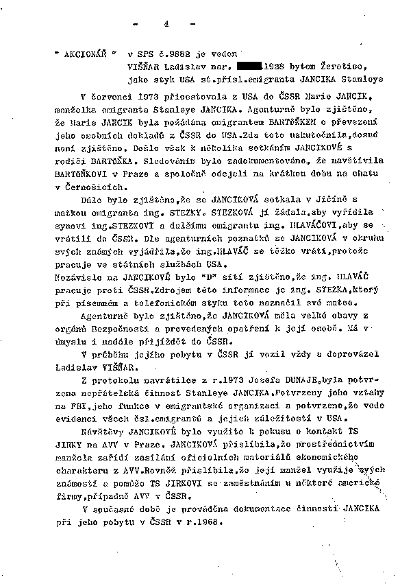 Dále bylo zjištěno, že se JANCIKOVá setkala v Jičíně s matkou emigranta ing. STEZKY. STEZKOVÁ jí žádala, aby vyřídila synovi ing.STEZKOVI a dalšímu emigrantu ing. HLAVÁČOVI, aby se vrátili do ČSSR. Dle agenturních poznatků se JANCIKOVÁ v okruhu svých známých vyjádřila, že ing.HLAVÁČ se těžko vrátí, protože pracuje ve státních službách USA.