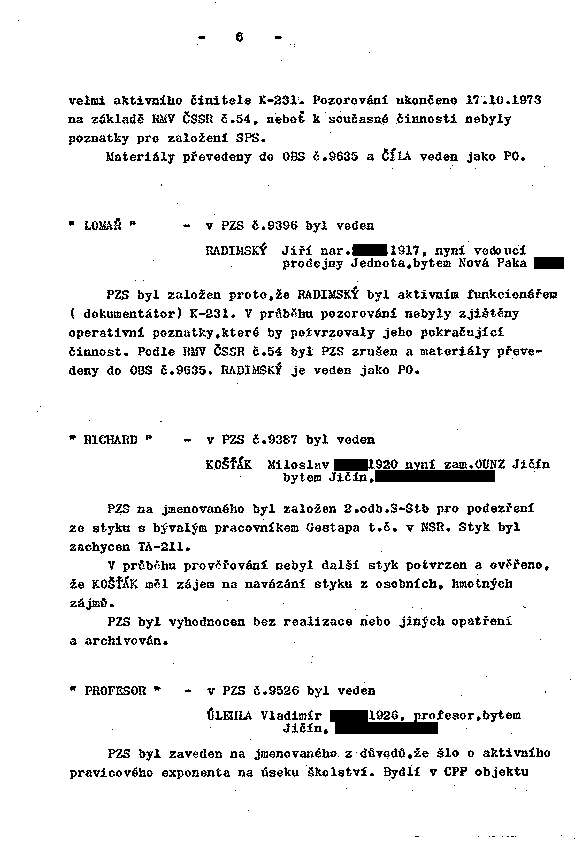 RADIMSKÝ Jiří nar. XXXX.1917, nyní vedoucí prodejny Jednota, bytem Nová Paka XXX
