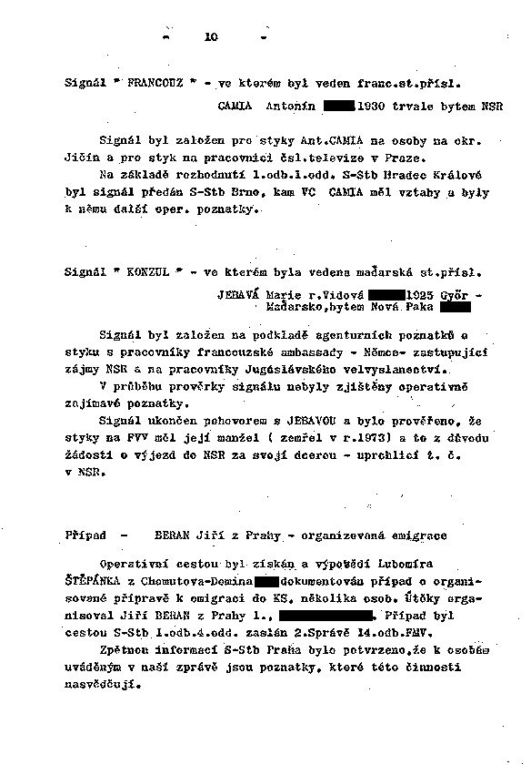 Signál byl založen na podkladě agenturních poznatků o styku s pracovníky francouzské ambassady - Němce- zastupující zájmy NSR a na pracovníky Jugoslávského velvyslanectví.