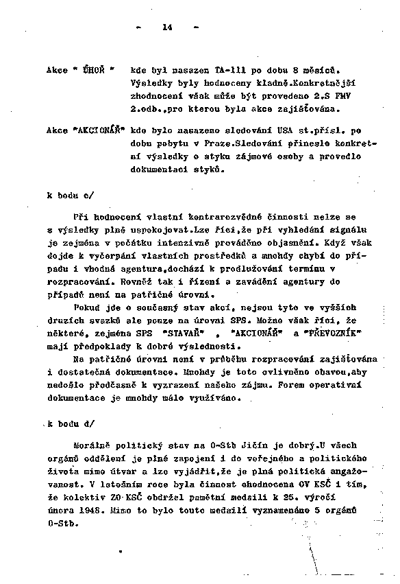 Morálně politický stav na O-Stb Jičín je dobrý. U všech orgánů oddělení je plné zapojení i do veřejného a politického života mimo útvar a lze vyjádřit, že je plná politická angažovanost. V letošním roce byla činnost ohodnocena OV KSČ i tím, že kolektiv ZO KSČ obdržel pamětní medaili k 25. výročí února 1948. Mimo to bylo touto medailí vyznamenáno 5 orgánů O-Stb.