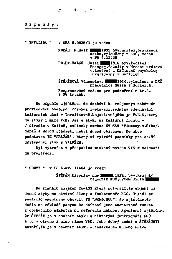 Do signálu zjištěno, že dochází ke vzájemným schůzkám pravicových osob, pod různými záminkami, zejména sjednávání kulturních akcí v Invalidovně. Nejaktivnějším je VALUŠ, který má styky i mimo VčK. Jde o styky na kulturní frontu - /divadlo v Kolíně, umělecký soubor ÚV SSM "Plameny-s.Říha/. Náplň a důvod schůzek, nebyl dosud objasněn. Do akce podstaven TS "PRAŽÁK", který si vytváří podmínky pro další důvěrnější styk s VALUŠEM.
