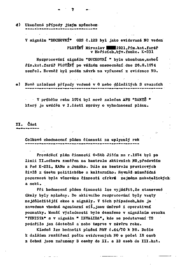 Rozpracování signálu "DUCHOVNÍ" bylo ukončeno, neboť řím.kat. farář PLOTĚNÝ po vážném onemocnění dne 26.6.1974 zemřel. Rovněž byl podán návrh na vyřazení z evidence NO.