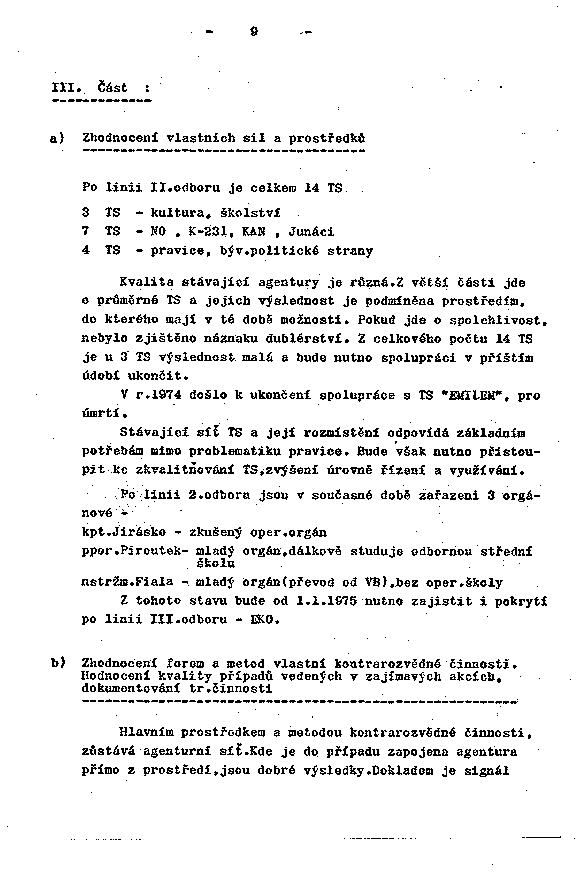 Kvalita stávající agentury je různá. Z větší části jde o průměrné TS a jejich výslednost je podmíněna protsředím, do kterého mají v té době možnosti. Pokud jde o spolehlivost, nebylo zjištěno náznaku dublérství. Z celkového počtu 14 TS je u 3 TS výslednost malá a bude nutno spolupráci v příštím údobí ukončit.