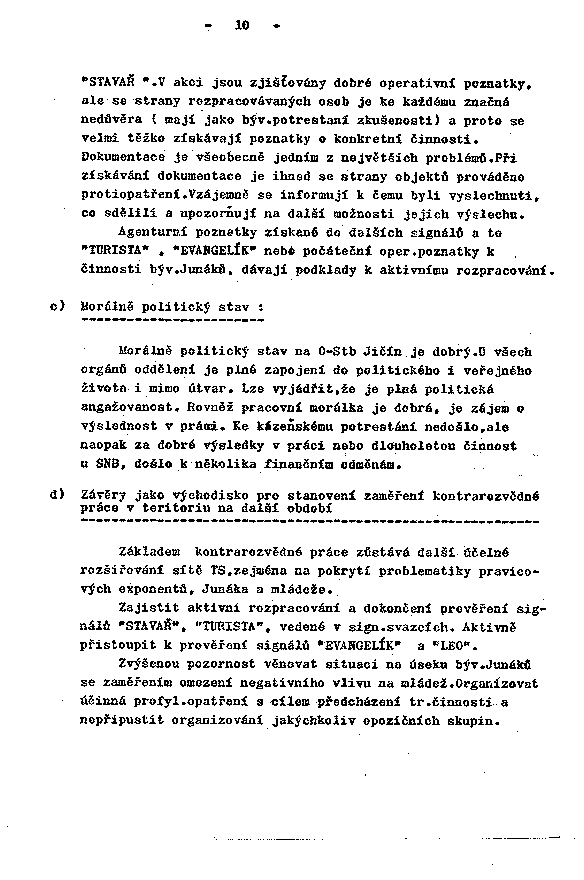 Agenturní poznatky získané do dalších signálů a to "TURISTA", "EVANGELÍK" nebo počáteční oper. poznatky k činnosti býv. Junáků, dávají podklady k aktivnímu rozpracování.