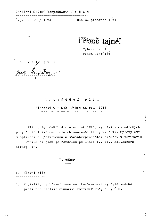 Plán práce O-Stb Jičín na rok 1975, vychází z metodických pokynů náčelníků centrálních součástí II., X. a XI. Správy FMV s aplikací na politickou a státobezpečnostní situaci v teritoriu.