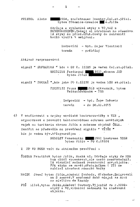 6) V součinnosti s orgány sovětské kontrarozvědky a VKR, organizovat a provádět kontrarozvědnou ochranu sovětských vojsk na teritoriu okresu Jičín a ochranu objektů ČSLA. Zaměřit se především na prověření signálu "VÍTĚŽ" kde je veden býv.bělogvardějec