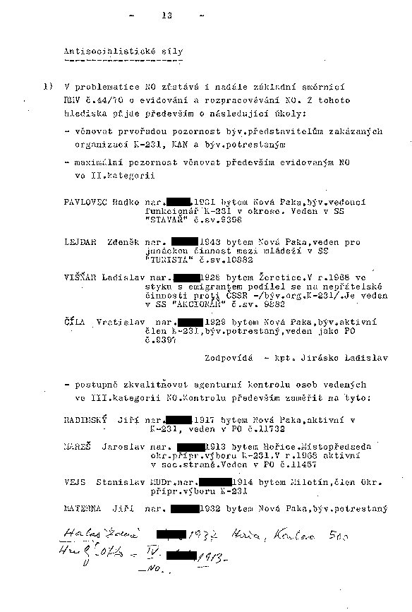 ČÍLA Vratislav nar. XXXX.1929 bytem Nová Paka, býv.aktivní člen K-231, býv.potrestaný, veden jako PO č.9397