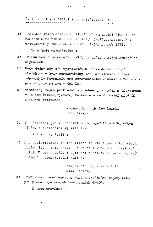 1) Provádět systematicky a cílevědomě kontrolní činnost se zaměřením na plnění rozhodujících úkolů, stanovených v prováděcím plánu činnosti O-Stb Jičín na rok 1975.