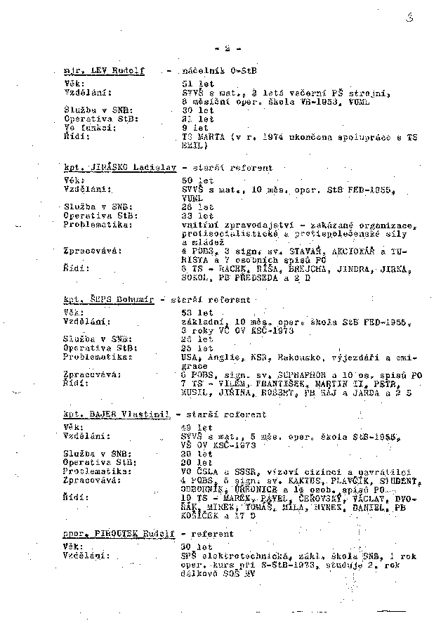 Vzdělání: základní, 10 měs.oper. škola StB FED-1955, 3 roky VČ OV KSČ-1973