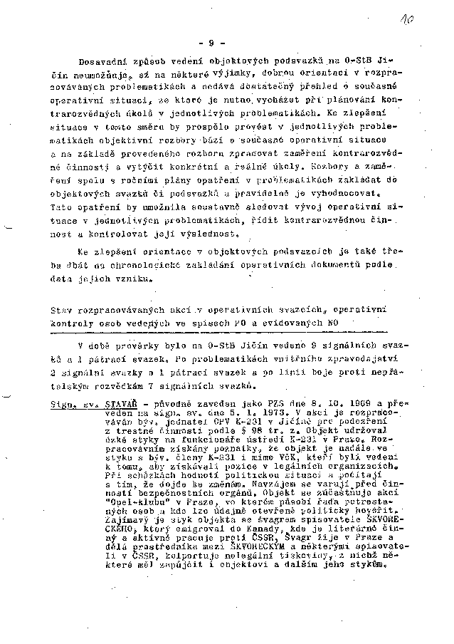 Sign. sv. STAVAŘ - původně zaveden jako PZS dne 8. 10. 1969 a převeden na sign. sv. dne 5. 1. 1973. V akci je rozpracováván býv. jednatel OPV K-231 v Jičíně pro podezření z trestné činnosti podle § 98 tr. z. Objekt udržoval úzké styky na funkcionáře ústředí K-231 v Praze. Rozpracováním získány poznatky, že objekt je nadále ve styku s býv. členy K-231 i mimo VčK, kteří byli vedeni k tomu, aby získávali pozice v legálních organizacích. Při schůzkách hodnotí politickou situaci a počítají s tím, že dojde ke změnám. Navzájem se varují před činností bezpečnostních orgánů. Objekt se zúčastňuje akcí "Opel-klubu" v Praze, ve kterém působí řada potrestaných osob a kde lze údajně otevřeně politicky hovořit. Zajímavý je styk objekta se švagrem spisovatele ŠKVORECKÉHO, který emigroval do Kanady, kde je literárně činný a aktivně pracuje proti ČSSR. Švagr žije v Praze a dělá prostředníka mezi ŠKVORECKÝM a některými spisovateli v ČSSR, kolportuje nelegální tiskoviny, z nichž některé měl zapůjčit i objektovi a dalším jeho stykům.