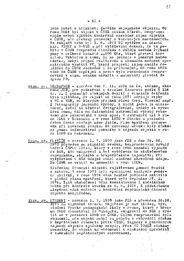 Sign. sv. STUDENT - zaveden 1. 7. 1970 jako PZS a převeden 16. 10. 1973 na signální svazek. Objektem je navrátilec, býv. student Vysoké pedagogické školy v Praze, který v březnu 1969 vycestoval do Rakouska, emigroval do NSR a vrátil se v prosinci 1969 do ČSSR. Cílem rozpracování bylo objasnit, zda objekt nebyl za pobytu v zahraničí získán k nepřátelské činnosti proti ČSSR. Signály o rozvědných zájmech objekta zjištěny nebyly. Přes TS TOMÁŠE získány poznatky, že objekt má vědomosti o získávání uprchlíků v zahraničí nepřátelskými rozvědkami.