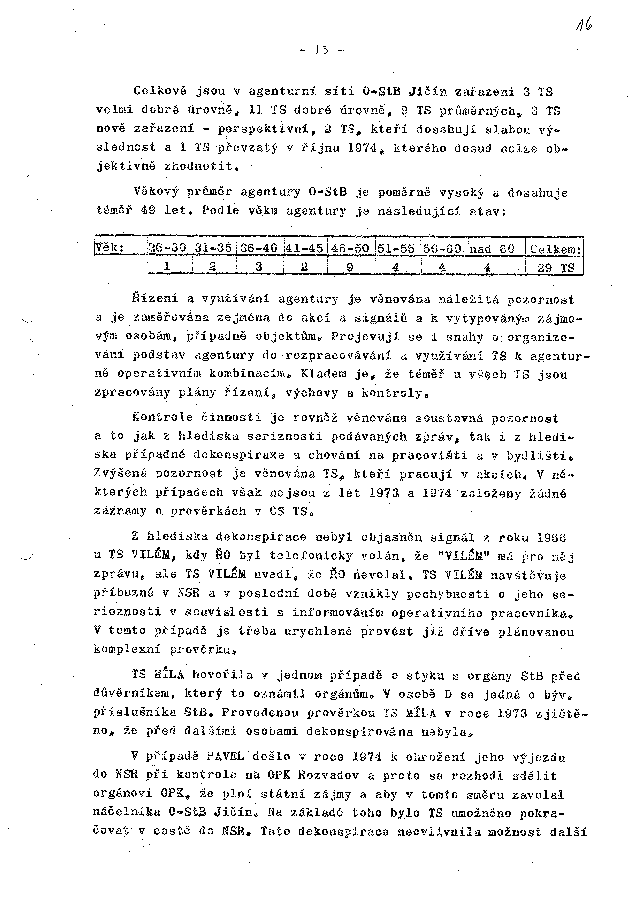 Celkově jsou v agenturní síti O-StB Jičín zařazeni 3 TS velmi dobré úrovně, 11 TS dobré úrovně, 8 TS průměrných, 8 TS nově zařazení - perspektivní, 2 TS, kteří dosahují slabou výslednost a 1 TS převzatý v říjnu 1974, kterého dosud nelze objektivně zhodnotit.