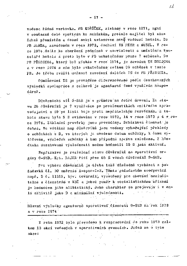 vedena žádná verbovka. PB KOŠÍČEK, získaný v roce 1971, není v současné době využíván ke schůzkám, protože majitel byl služebně přemístěn a dosud nebyl ustanoven nový vedoucí hotelu. Do PB JARDA, zavedeném v roce 1973, dochází TS PETR a MUSIL. V roce 1974 došlo ke zhoršení podmínek v souvislosti s umístěním kanceláří hotelu a proto bylo v PB uskutečněno pouze 7 schůzek. Do PB PŘEDSEDA, který byl získán v roce 1974, je zaveden TS BREJCHA a v roce 1974 s ním bylo uskutečněno celkem 20 schůzek v tomto PB. Je třeba zvážit možnost zavedení dalších TS do PB PŘEDSEDA.