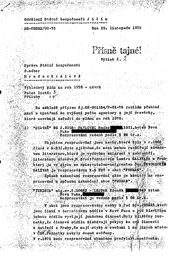 Na základě přípisu čj.OS-001154/2-01-75 zasílám přehled akcí a opatření ke zvýšení počtu agentury a její prověrky, které navrhuji zařadit do plánu na rok 1976.
