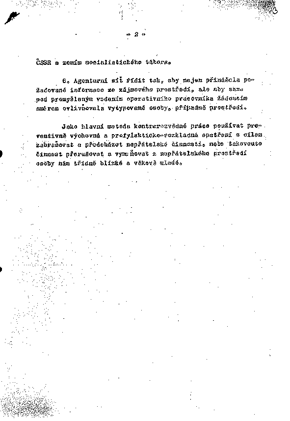6. Agenturní síť řídit tak, aby nejen přinášela požadované informace ze zájmového prostředí, ale aby sama pod promyšleným vedením operativního pracovníka žádoucím směrem ovlivňovala vytypované osoby, případně prostředí.