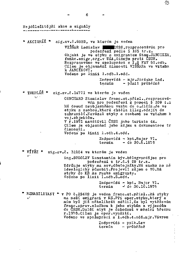 VIŠŇAR Ladislav XXXX.1928, rozpracováván pro podezření podle § 105 tr.z.