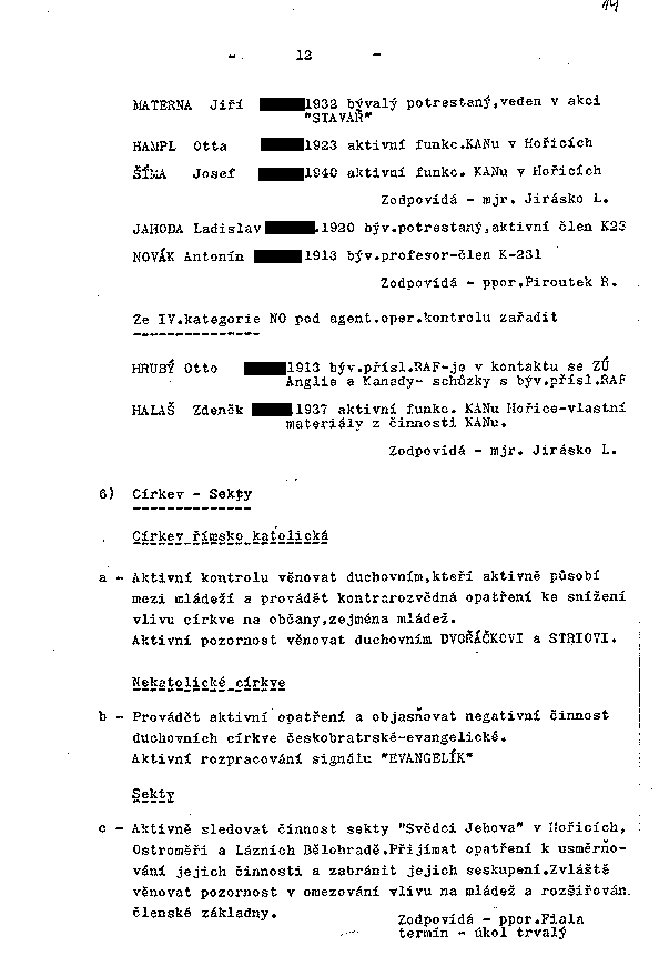 a - Aktivní kontrolu věnovat duchovním, kteří aktivně působí mezi mládeží a provádět kontrarozvědná opatření ke snížení vlivu církve na občany, zejména mládež.