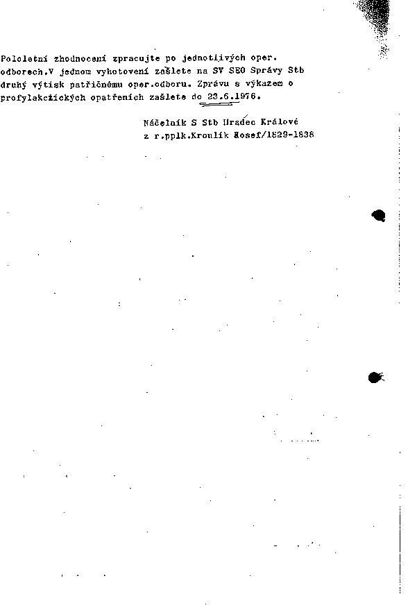 Pololetní zhodnocení zpracujte po jednotlivých oper. odborech. V jednom vyhotovení zašlete na SV SEO Správy Stb druhý výtisk patřičnému oper.odboru. Zprávu s výkazem o profylakctických opatřeních zašlete do 23.6.1976.