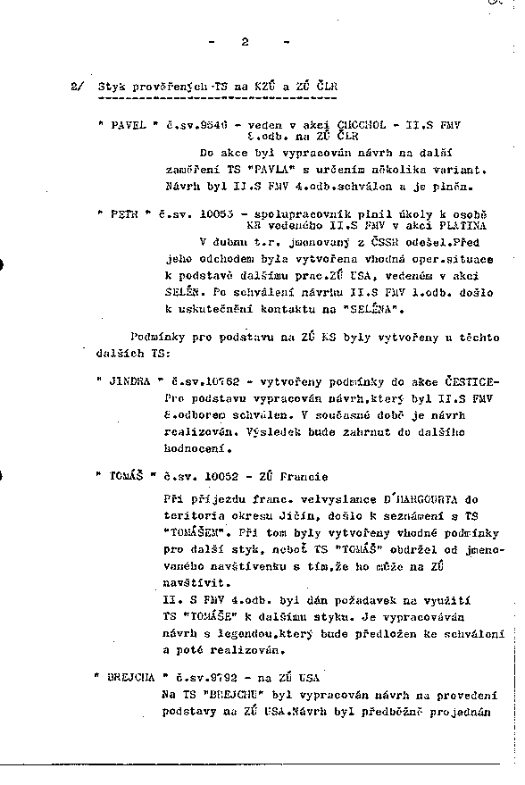 V dubnu t.r. jmenovaný z ČSSR odešel. Před jeho odchodem byla vytvořena vhodná oper. situace k podstavě dalšímu prac. ZÚ USA, vedeném v akci SELÉN. Po schválení návrhu II.S FMV 1.odb. došlo k uskutečnění kontaktu na "SELÉNA".