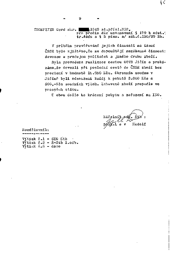 V průběhu prověřování jejich činnosti na území ČSSR bylo zjištěno, že se dopouštějí nezákonné činnosti dovozem a prodejem počítaček a jiného druhu zboží.