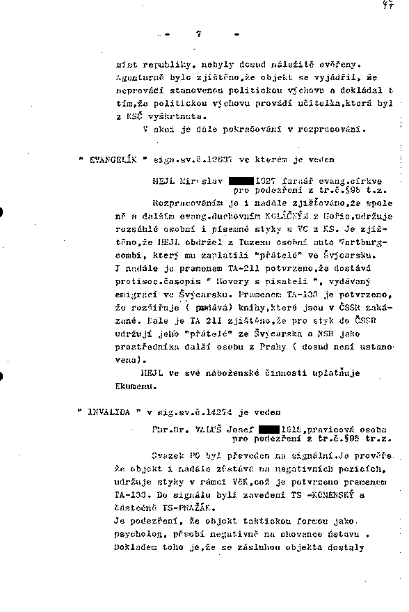 Rozpracováním je i nadále zjišťováno, že společně s dalším evang. duchovním KOLÁČNÝM z Hořic, udržuje rozsáhlé osobní i písemné styky s VC z KS. Je zjištěno, že HEJL obdržel z Tuzexu osobní auto Wartburg-combi, který mu zaplatili "přátelé" ve Švýcarsku. I nadále je pramenem TA-211 potvrzeno, že dostává protisoc. časopis "Hovory s pisateli", vydávaný emigrací ve Švýcarsku. Pramenem TA-133 je potvrzeno, že rozšiřuje (prodává) knihy, které jsou v ČSSR zakázané. Dále je TA 211 zjištěno, že pro styk do ČSSR udržují jeho "prátelé" ze Švýcarska a NSR jako prostředníka další osobu z Prahy (dosud není ustanovena).