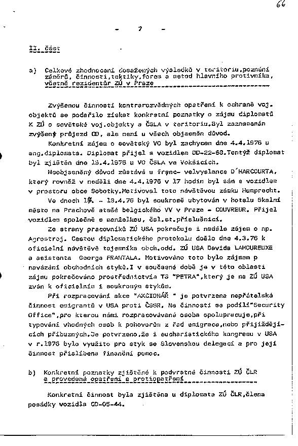 Ze strany pracovníků ZÚ USA pokračuje i nadále zájem o np. Agrostroj. Cestou diplomatického protokolu došlo dne 4.3.76 k oficielní návštěvě tajemníka obch.odd. ZÚ USA Davida LAMOUREUXE a asistenta George FRANTALA. Motivováno toto bylo zájmem o navázání obchodních styků. I v současné době je v této oblasti zájmu pokračováno prostřednictvím TS "PETRA", který je na ZÚ USA zván k oficielním i soukromým stykům.