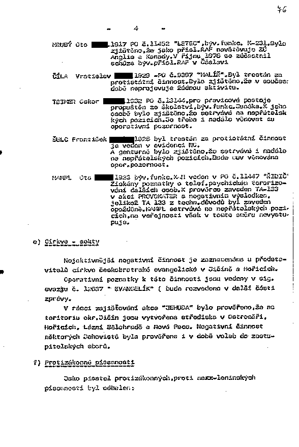 HRUBÝ Oto XXXX.1917 PO č. 11452 "LETEC", býv.funkc. K-231. Bylo zjištěno, že jako přisl. RAF navštěvuje ZÚ Anglie a Kanady. V říjnu 1976 se zúčastnil schůze býv. přísl. RAF v Čáslavi