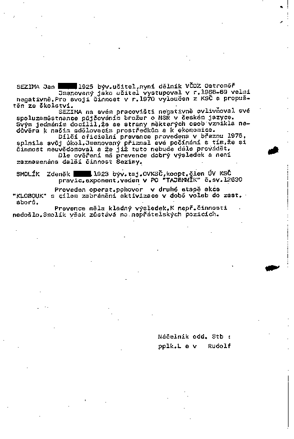Proveden operat. pohovor v druhé etapě akce "KLOBOUK" s cílem zabránění aktivizace v době voleb do zast. sborů.