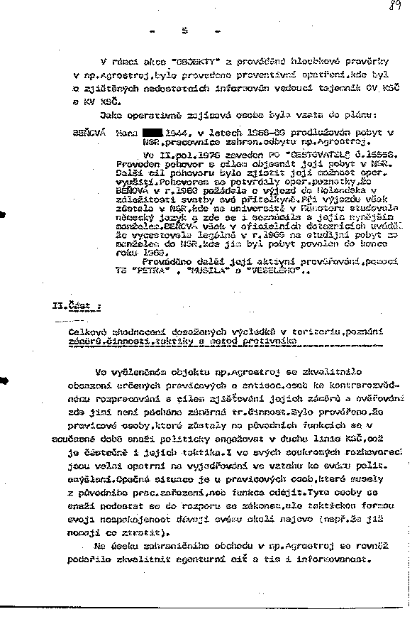 Ve vyčleněném objektu np.Agrostroj se zkvalitnilo obsazení určených pravicových a antisoc.osob ke kontrarozvědnému rozpracování s cílem zjišťování jejich záměrů a ověřování, zda jimi není páchána záměrná tr.činnost. Bylo prověřeno, že pravicové osoby, které zůstaly na původních funkcích se v současné době snaží politicky angažovat v duchu linie KSČ, což je částečně i jejich taktika. I ve svých soukromých rozhovorech jsou velmi opatrní na vyjadřování ve vztahu ke svému polit. smýšlení. Opačná situace je u pravicových osob, které musely z původního prac. zařazení, neb funkce odejít. Tyto osoby se snaží nedostat se do rozporu se zákonem, ale taktickou formou svoji nespokojenost dávájí svému okolí najevo (např. že již nemají co ztratit).
